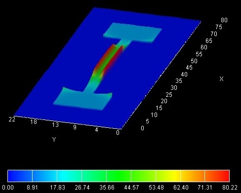 In Figure 2.5.164 the electron density inside the MOSFET structure at \(0.2\,\mathrm{V}\) is shown. The corresponding data is contained in the file bias_00002\density_electron.avs.fld. One can clearly see that the electron density has the highest values at the \(\mathrm{Si}-\mathrm{SiO}_2\) interfaces.