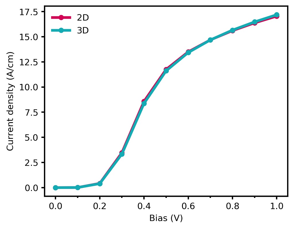 Figure 2.5.166 Comparison of the current-voltage characteristics between 2D and 3D simulations.