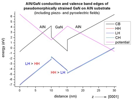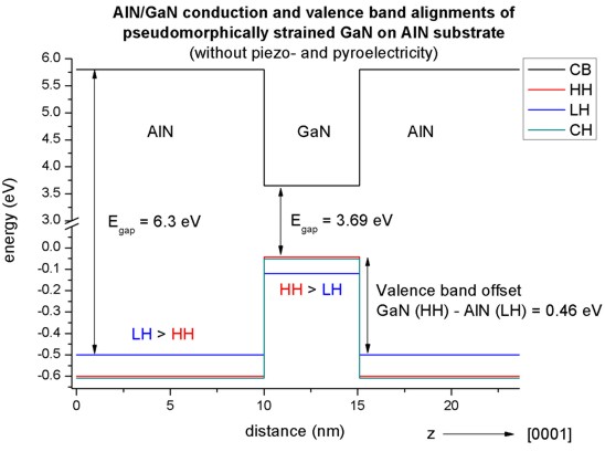 Figure 2.5.173 shows the conduction and valence band edge alignment in AlN/GaN structures (unstrained). In AlN, the light hole (LH) is the highest valence band whereas in GaN, this is the heavy hole (HH). We assumed a valence band offset of VBO = 0.5 eV, the conduction band offset is much larger (CBO = 2.3 eV). All material parameters are based on [Andreev2000] although meanwhile better parameters are available.