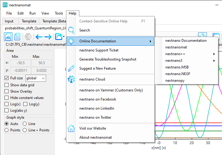 In the Help menu, information about the software and direct links to the nextnano online documentation of each simulation tool can be found. Furthermore, there are a couple of contact possibilities listed, from our customer support portal nextnano Help Center to our social media accounts. If you plan to contact support, the menu function Generate System Snapshot for Troubleshooting generates a text file which you can attach to your request.